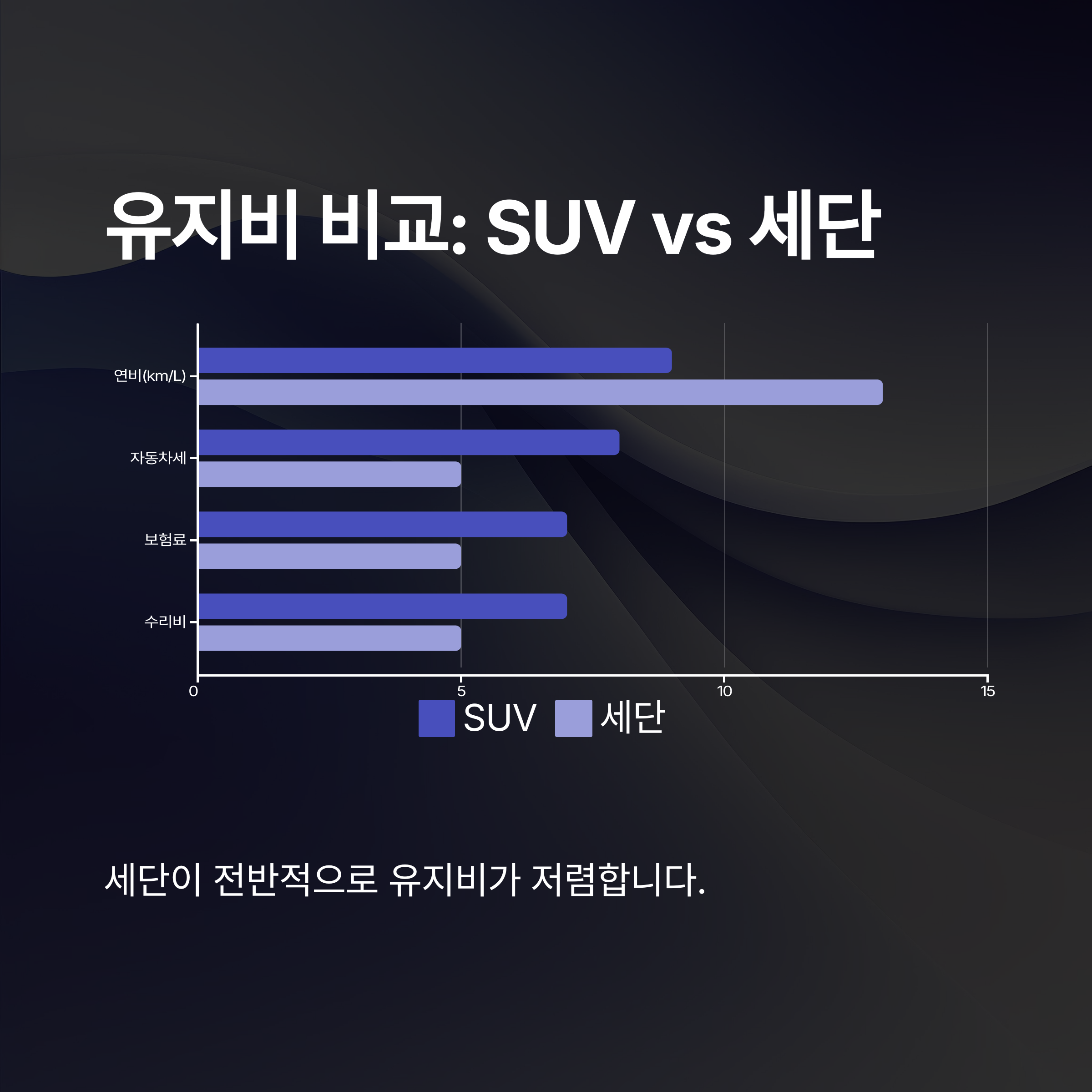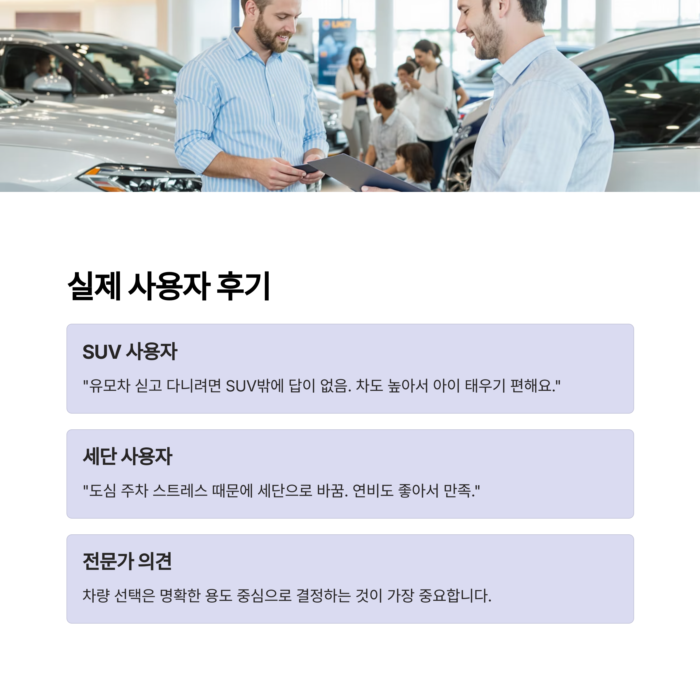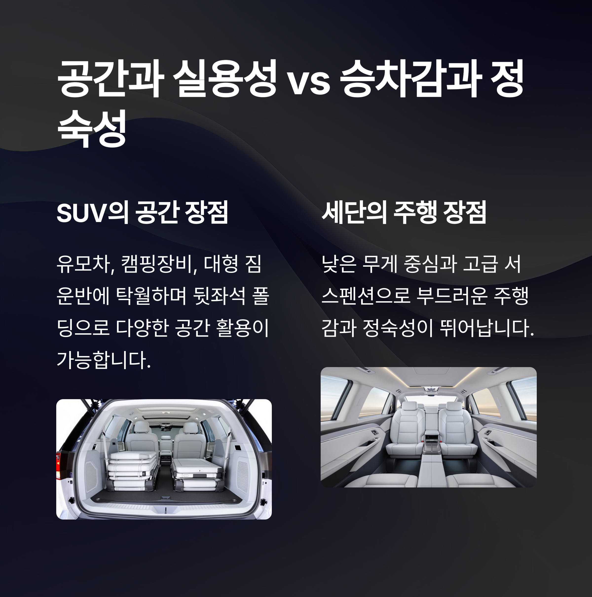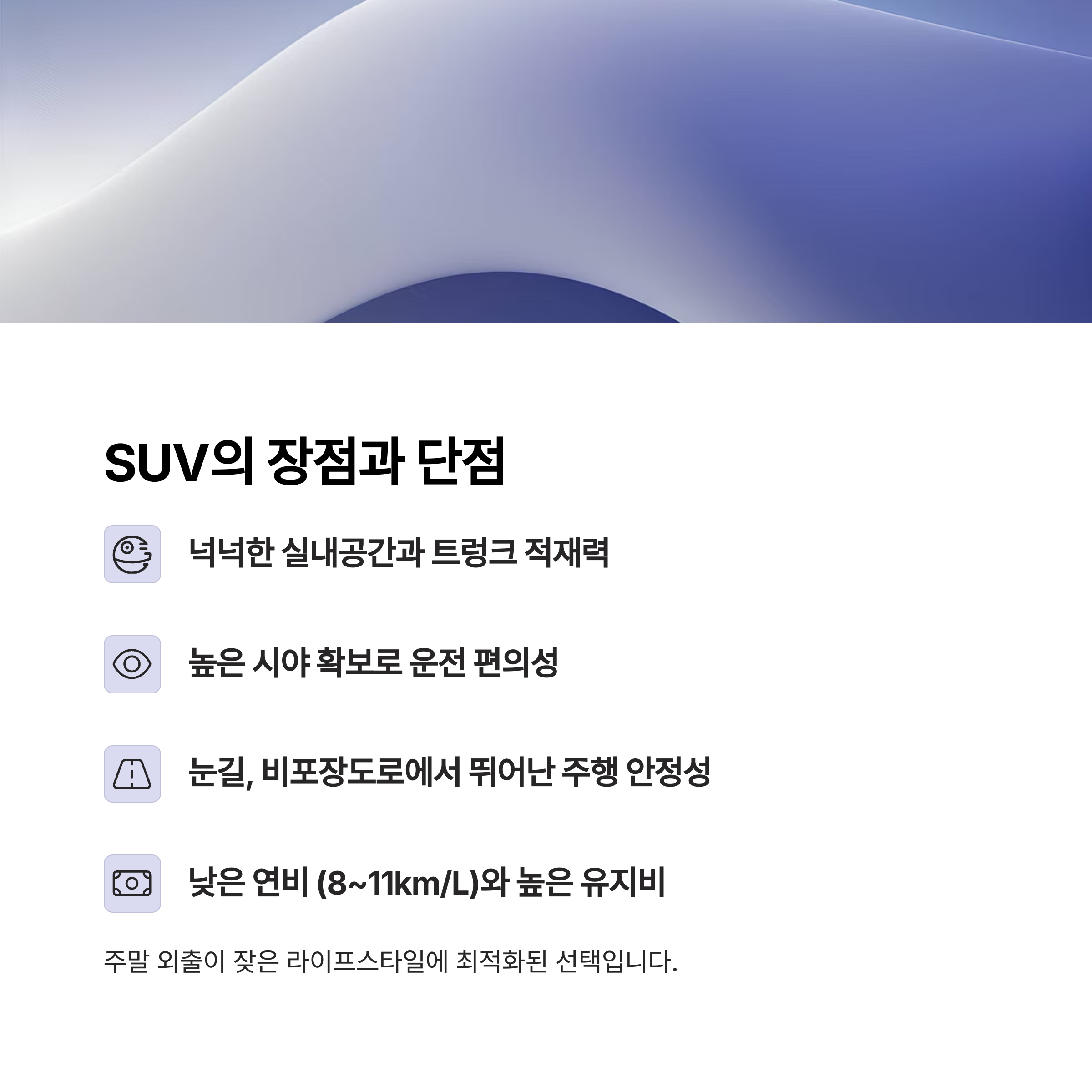 ✅ SUV는 아이가 있는 가족이나 주말 외출이 잦은 라이프스타일에 최적화된 선택입니다.