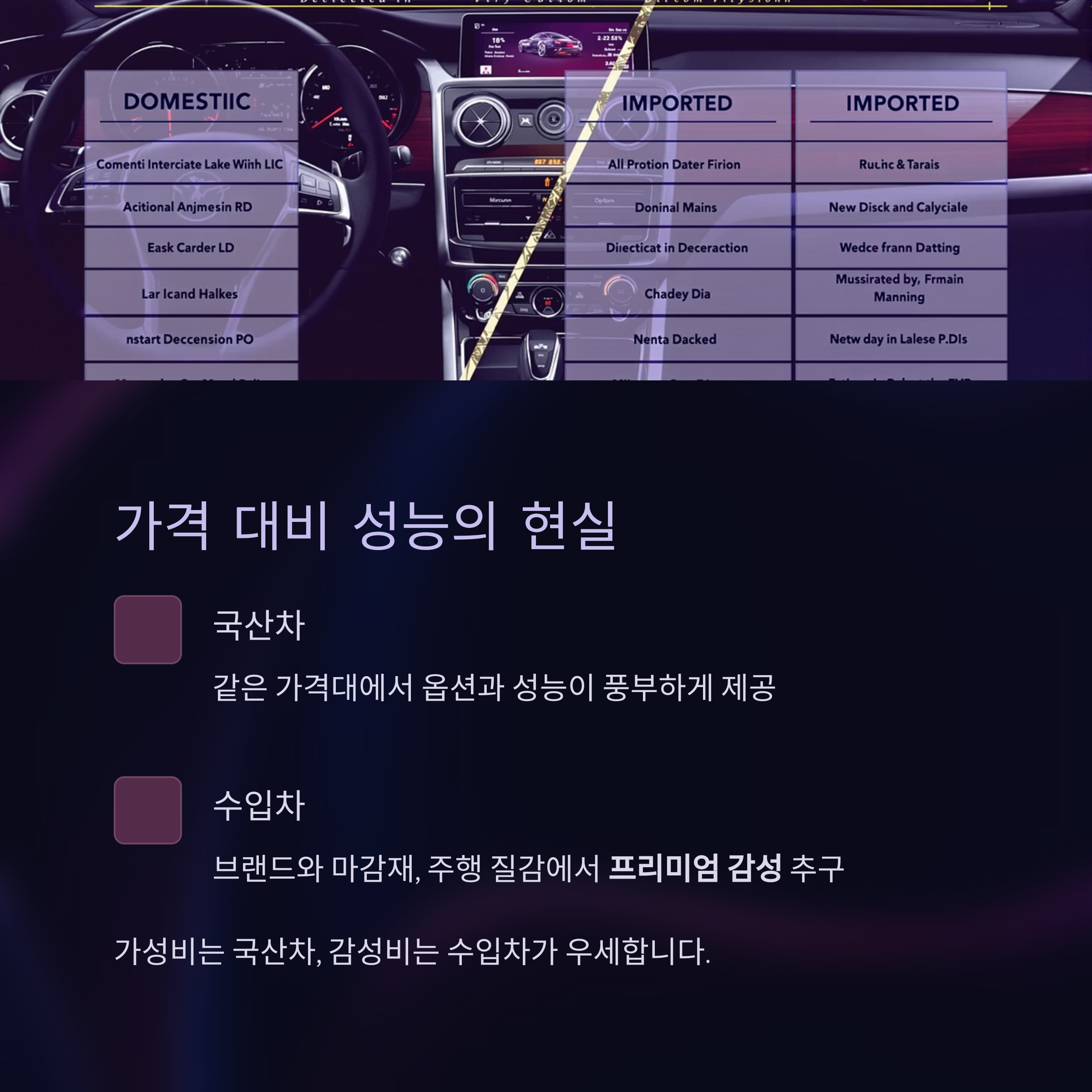 국산차는 같은 가격대에서 더 많은 옵션과 기능을 제공하는 반면, 수입차는 브랜드와 주행 질감, 마감 퀄리티에서 프리미엄 감성을 중시합니다.
