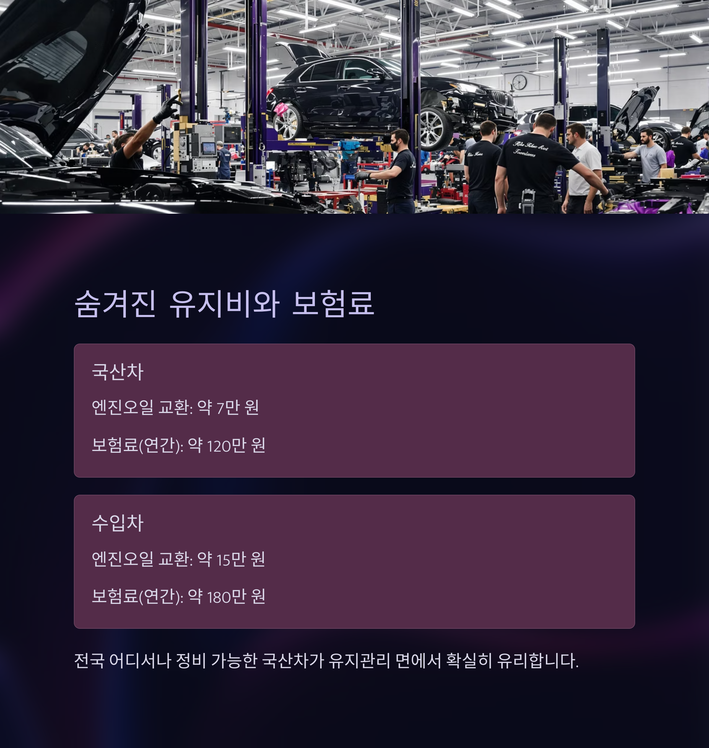 - 🔧 국산차는 정비 인프라가 넓고 유지비가 저렴