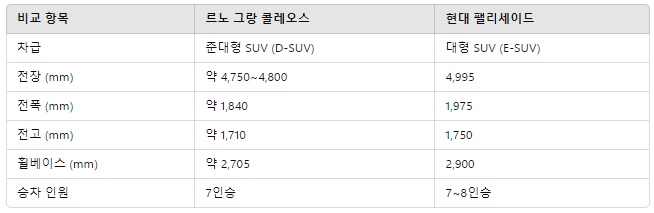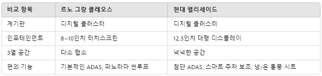 르노 그랑 콜레오스 vs. 현대 팰리세이드 비교분석