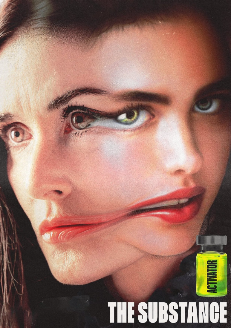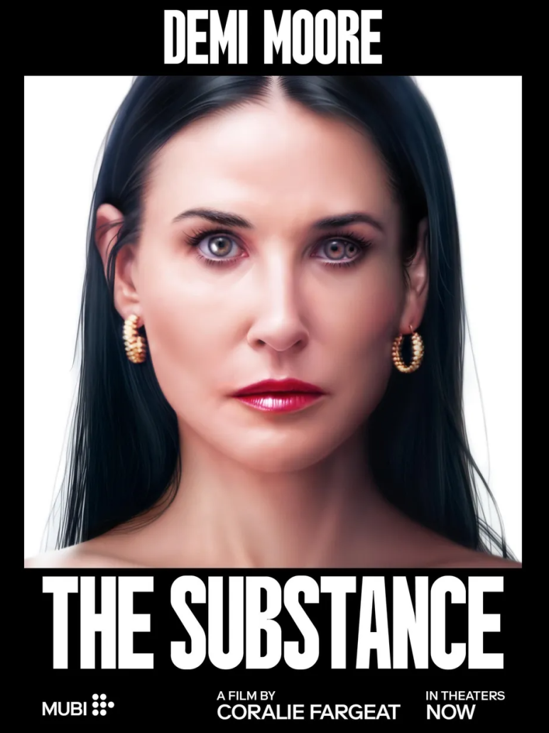 - 데미 무어의 포스터: 주름 하나 없는 완벽한 얼굴이 클로즈업되었으며, 오른쪽 눈의 수정체가 두 개로 겹쳐져 있어 서브스턴스 사용 후의 변화를 암시합니다. 아름다움과 기괴함이 공존하는 모습이 강한 인상을 남깁니다.