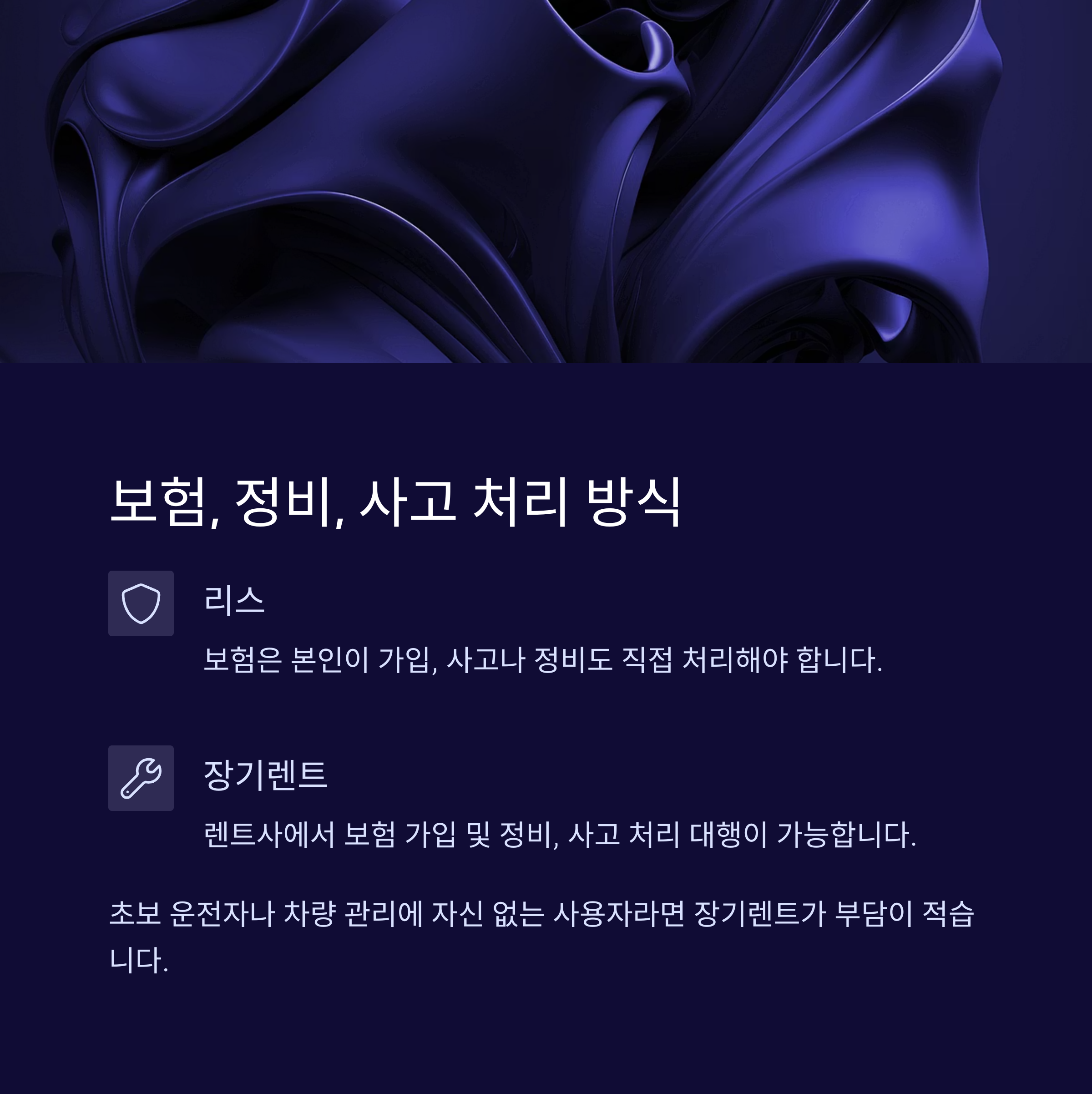 • 리스: 보험은 본인이 가입, 사고나 정비도 직접 처리