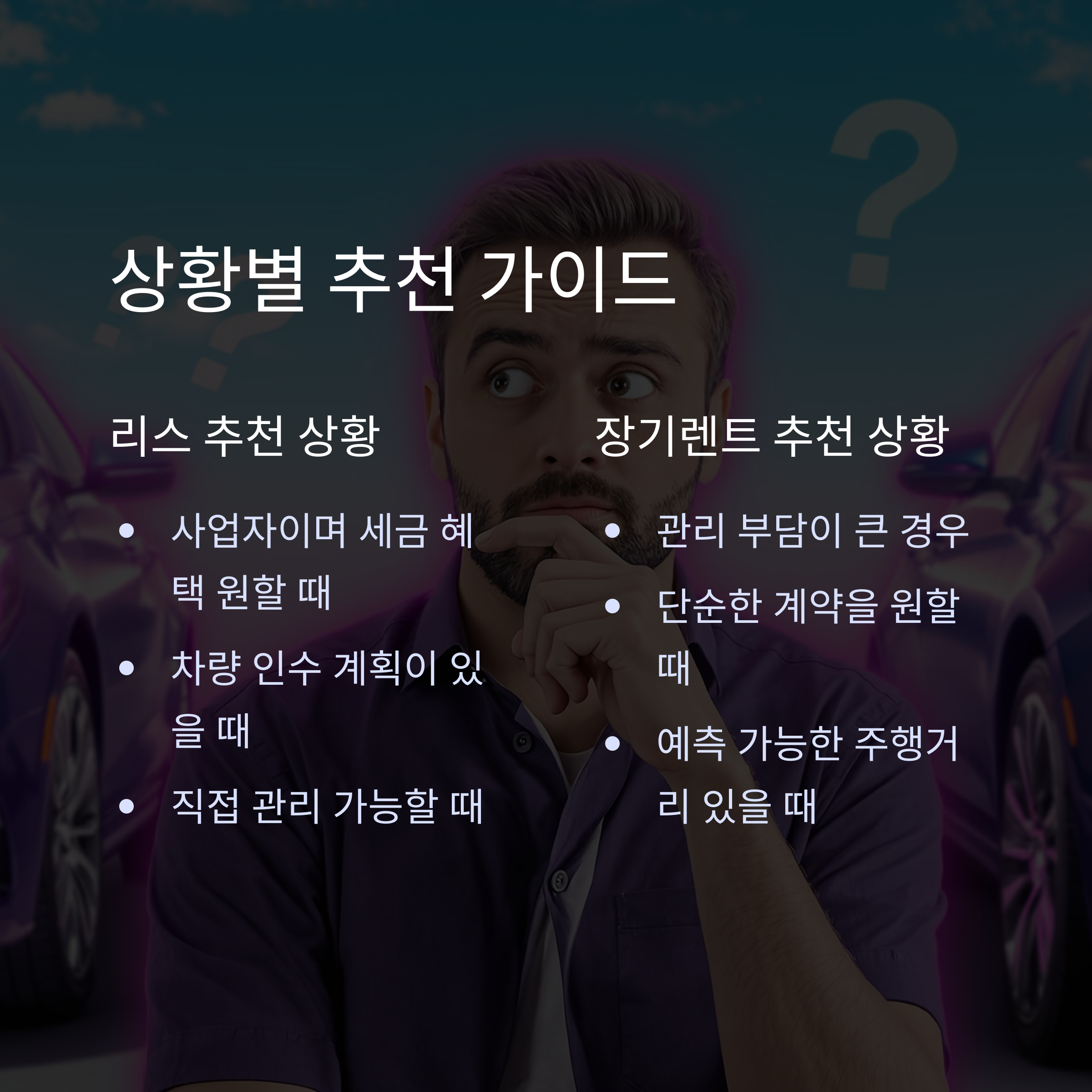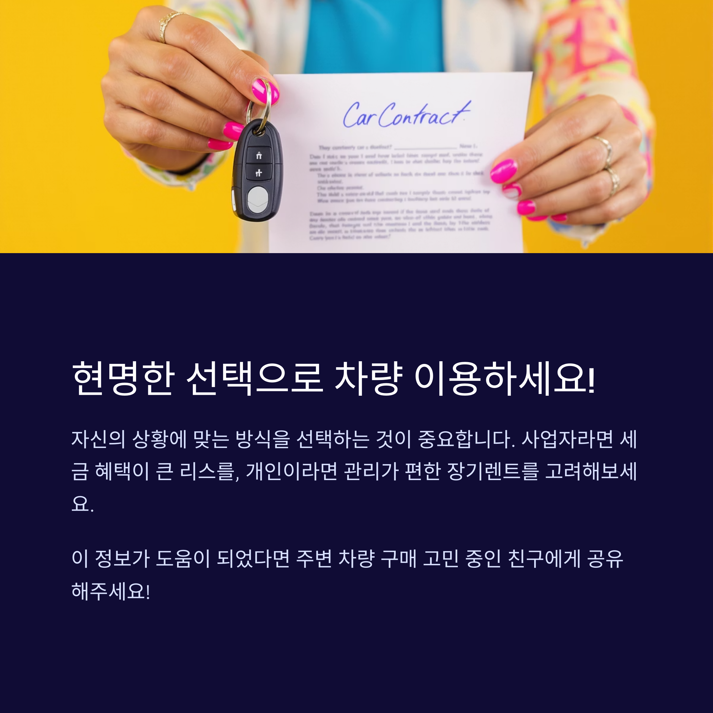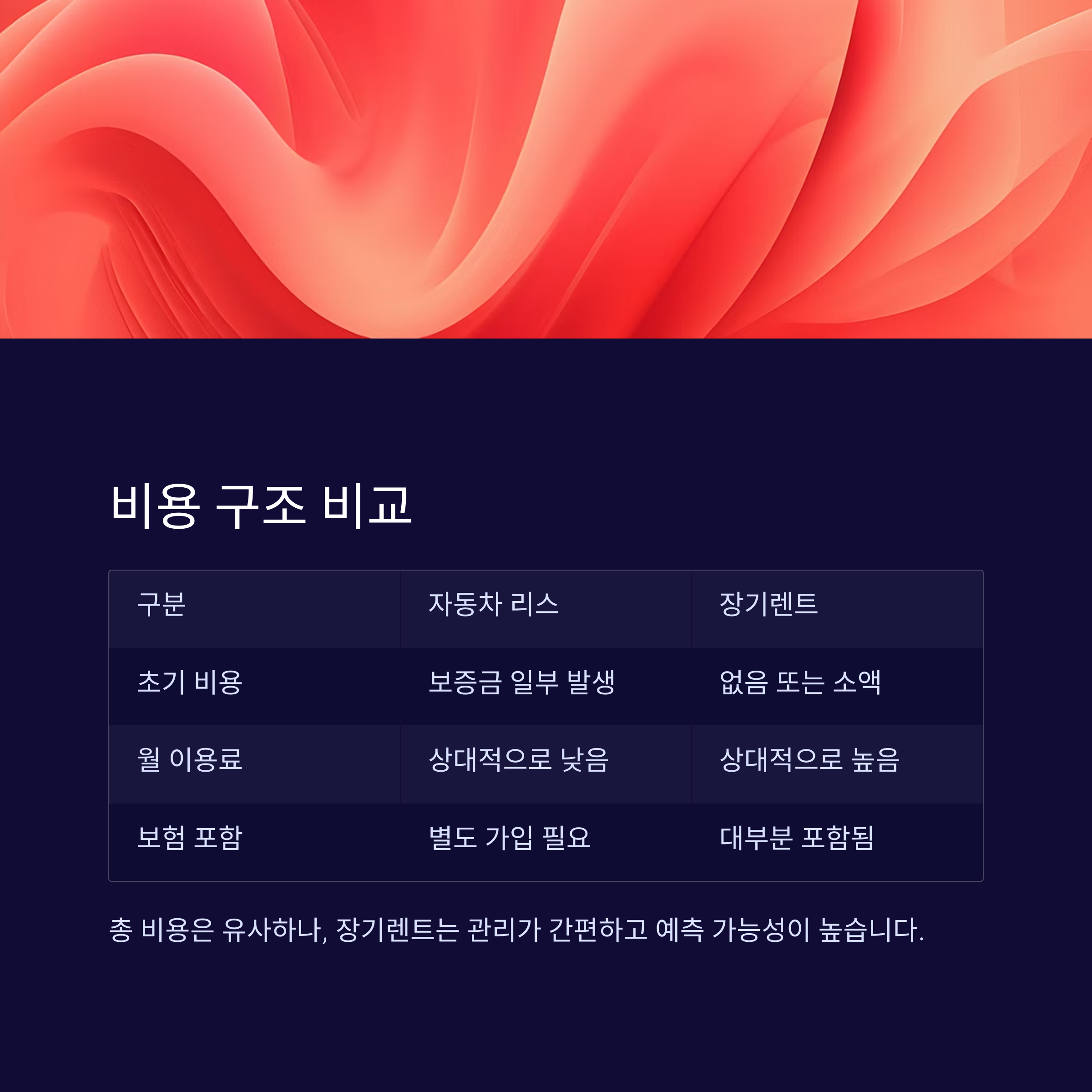 👉 총 비용은 유사하나, 장기렌트는 관리가 간편하고 예측 가능성이 높습니다.