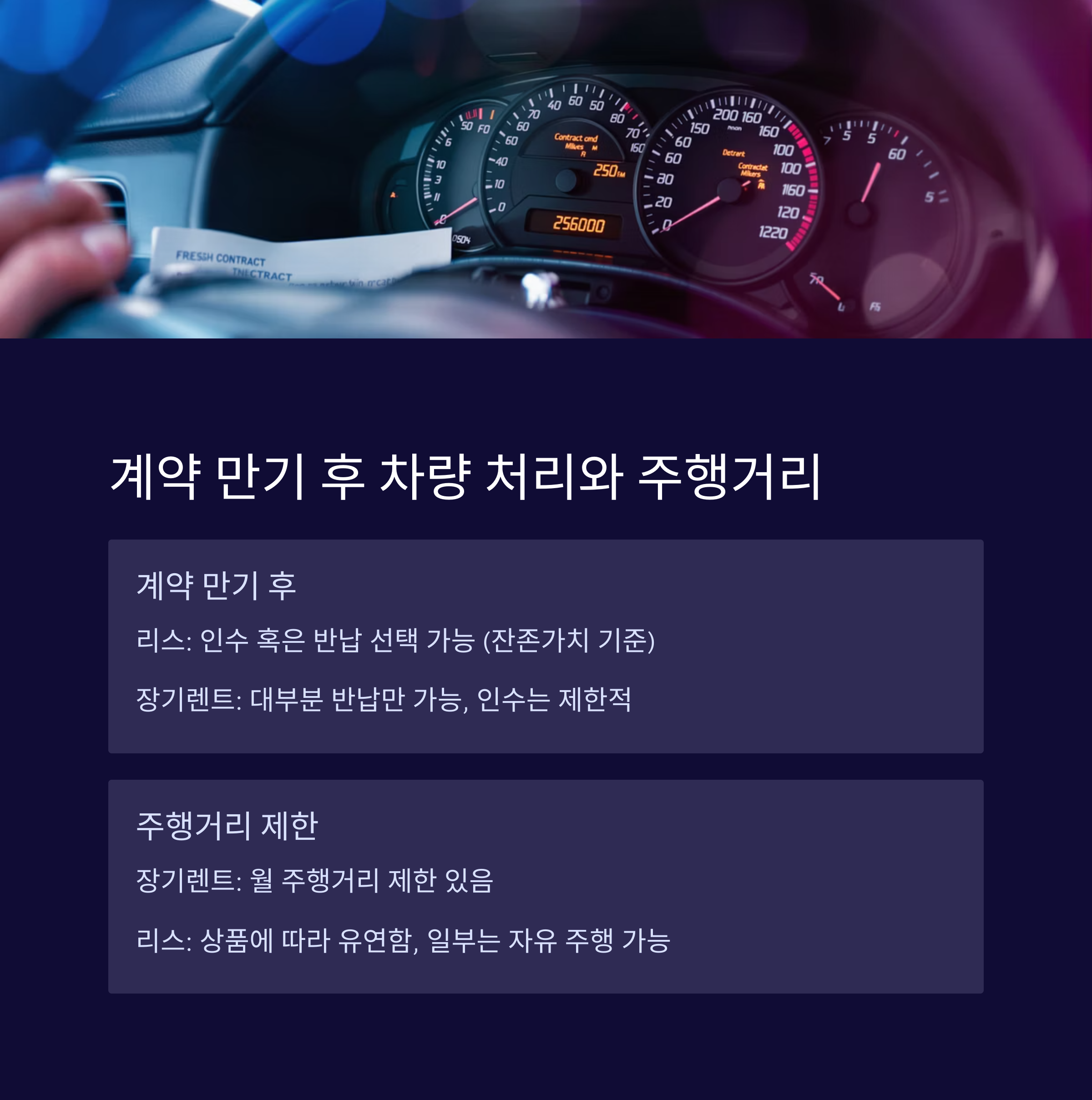 - 장기렌트: 대부분 반납만 가능, 인수는 제한적이며 추가 비용 발생 가능성