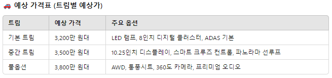 경쟁 모델보다 200~300만 원 저렴하게 출시될 가능성이 높아 가격 경쟁력이 뛰어납니다.