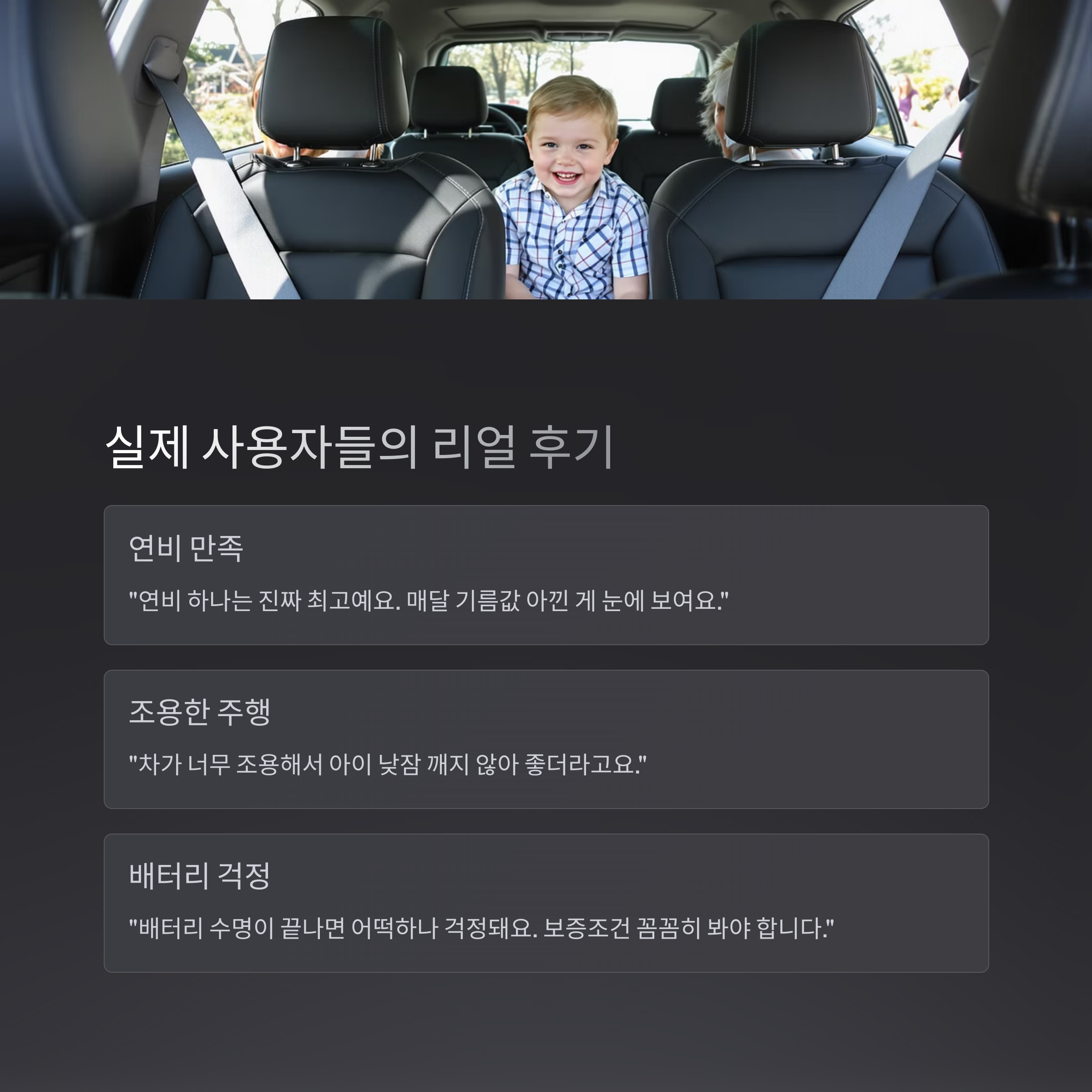 • “차가 너무 조용해서 아이 낮잠 깨지 않아 좋더라고요.”