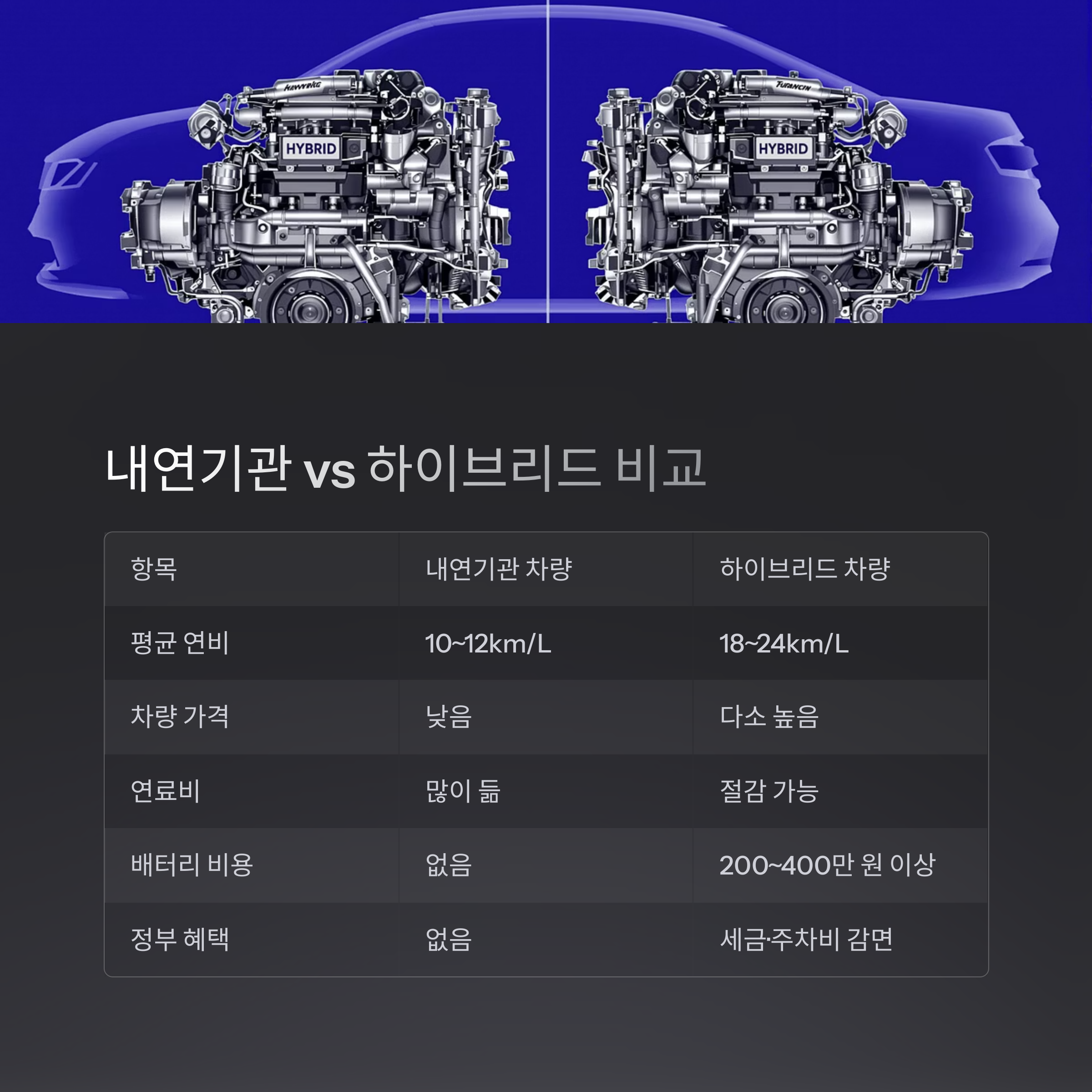 비교 표: 내연기관 차량 vs 하이브리드 차량