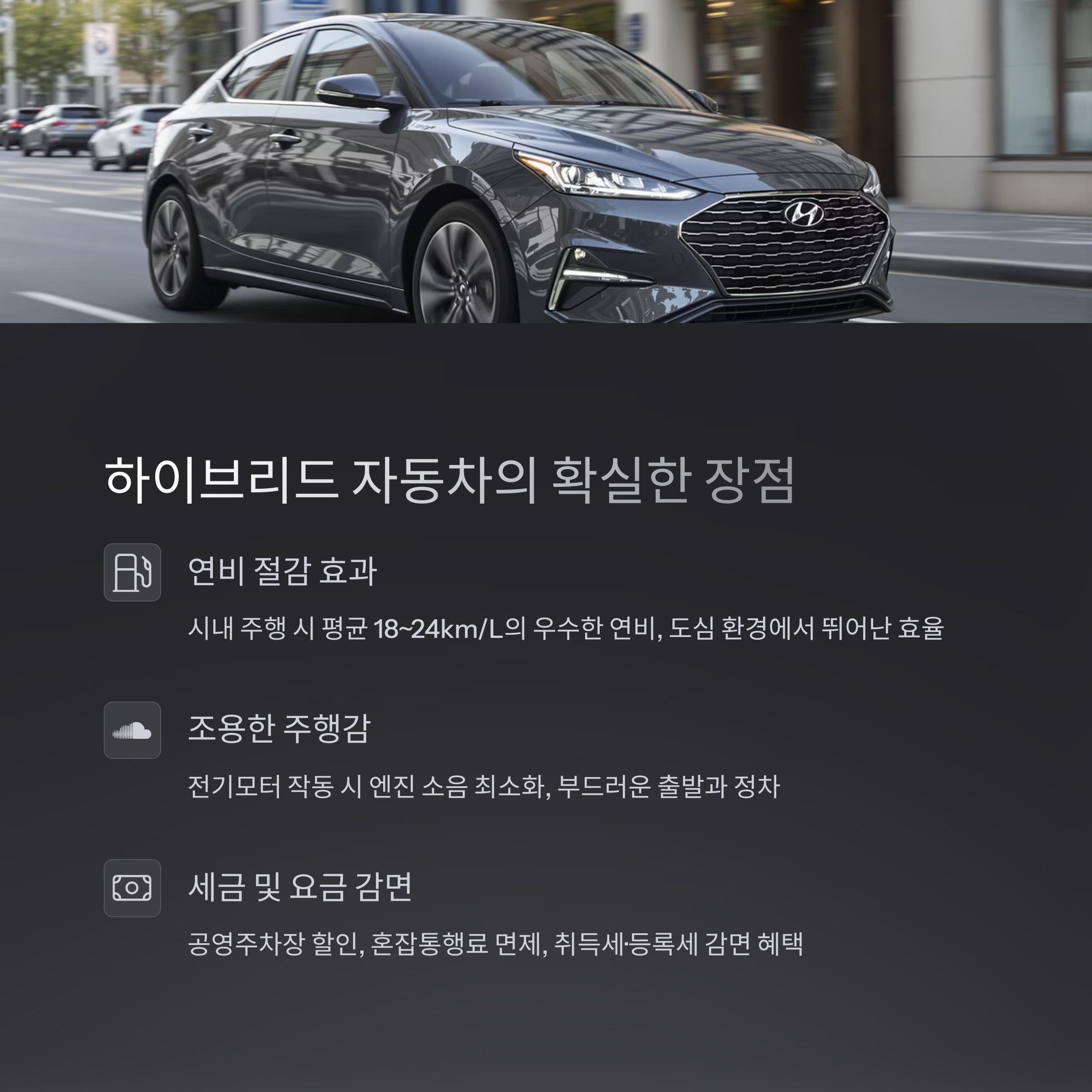 • 시내 주행 시 전기모터가 주로 작동하여 연비가 평균 18~24km/L로 매우 우수
