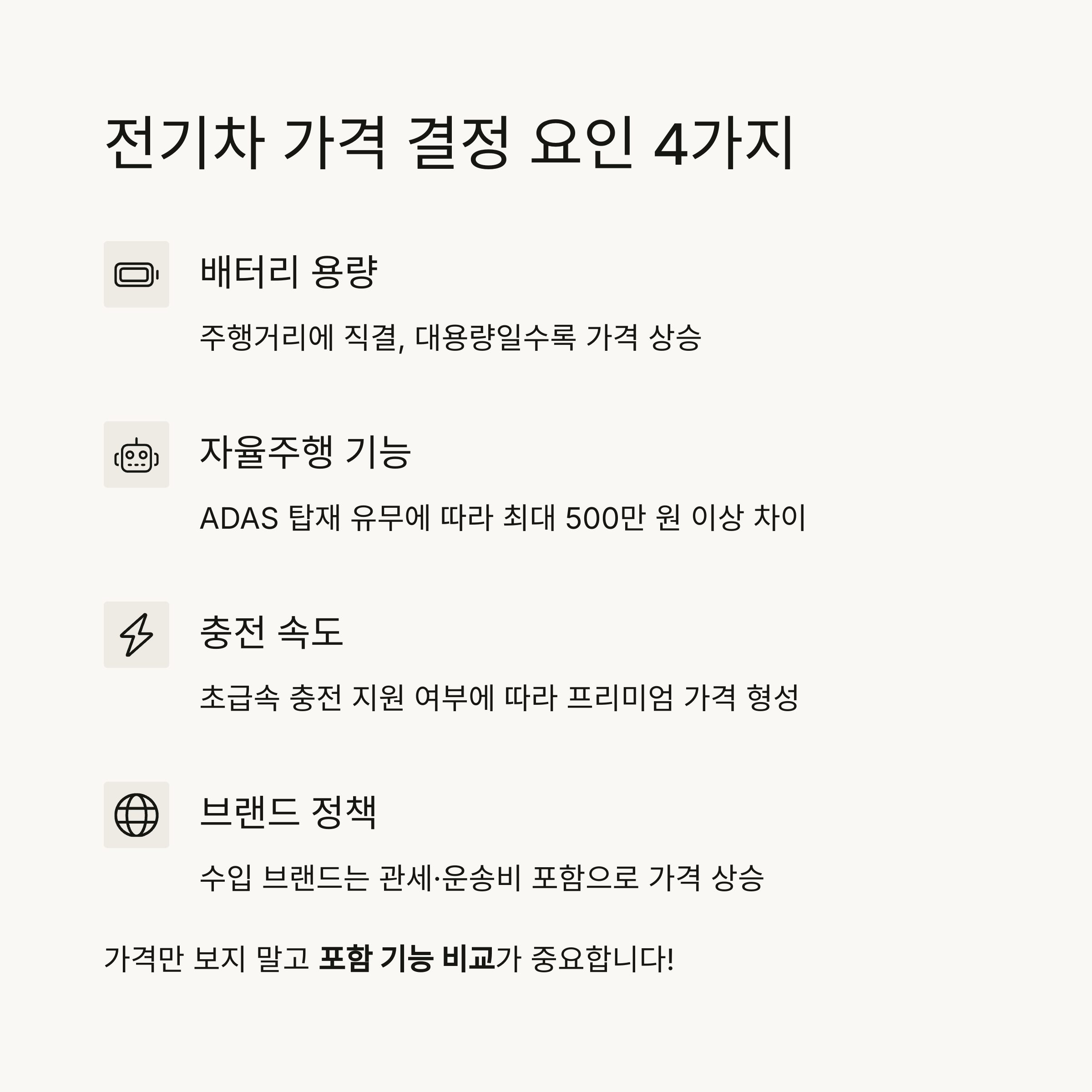| 배터리 용량 | 주행거리에 직결, 대용량일수록 가격 상승 |