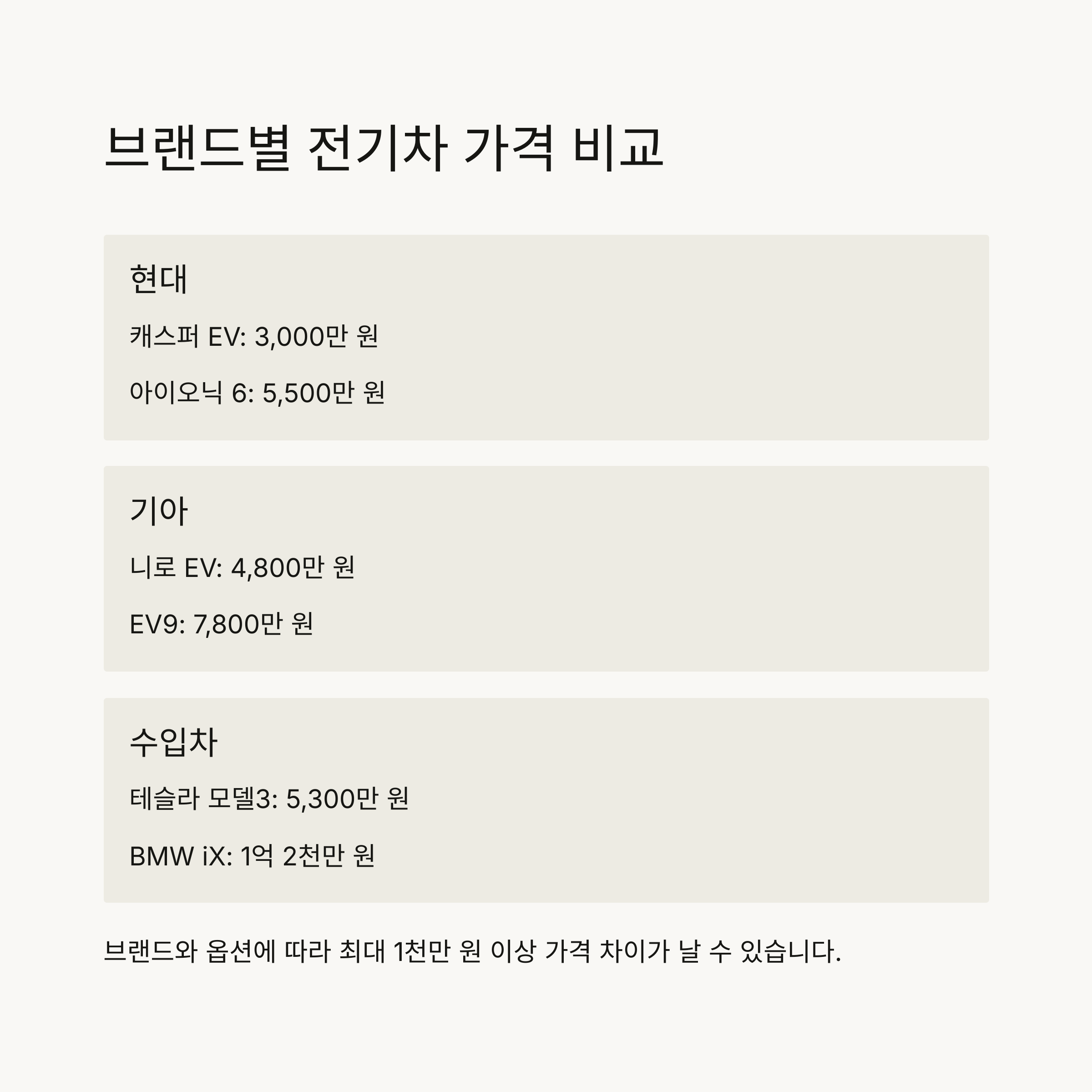 🔹 Tip: 3천만 원 이하 보급형 전기차도 많지만, 고급 전기차는 여전히 5천만 원 이상을 감안해야 합니다.