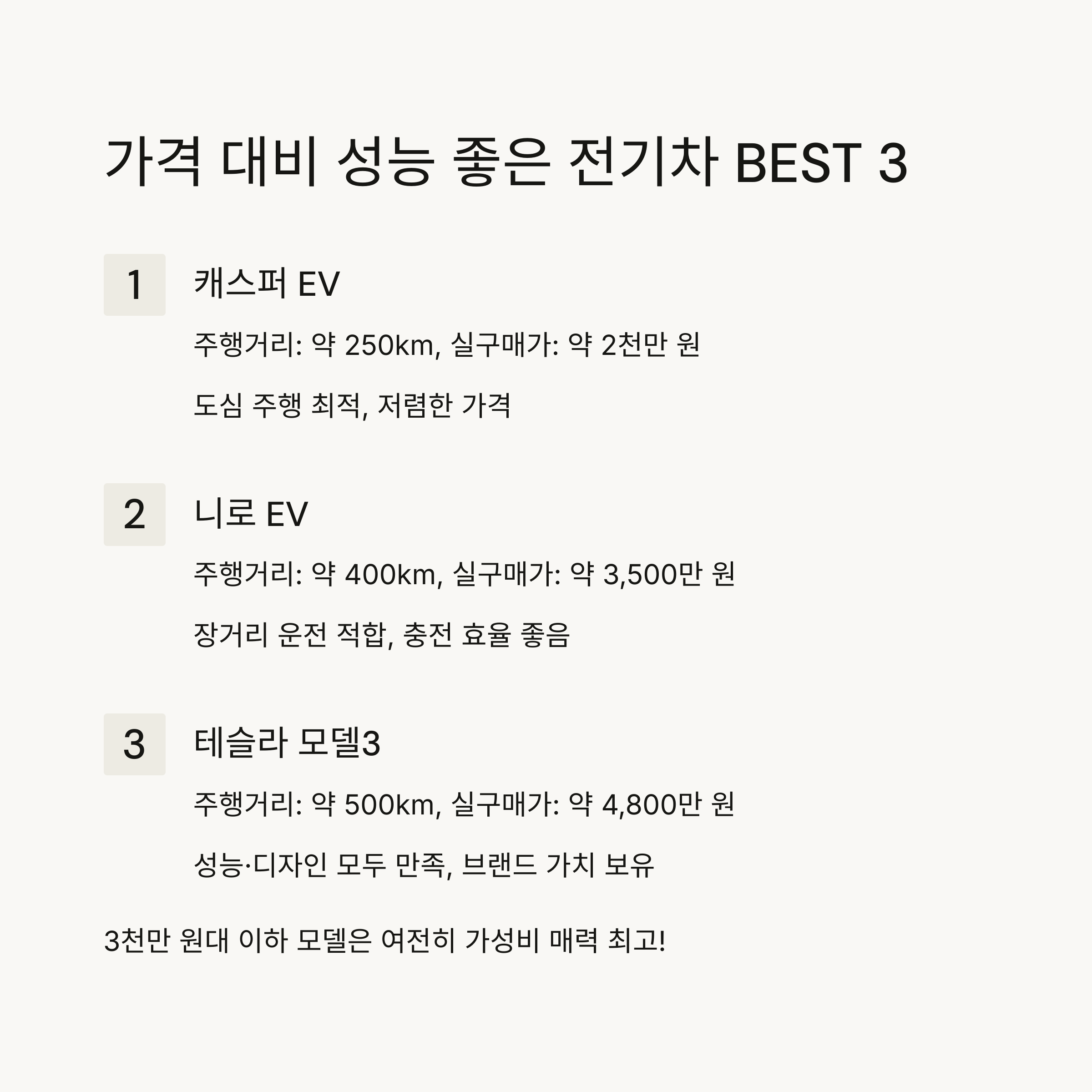 🔝 가격 대비 성능 좋은 전기차 BEST 3