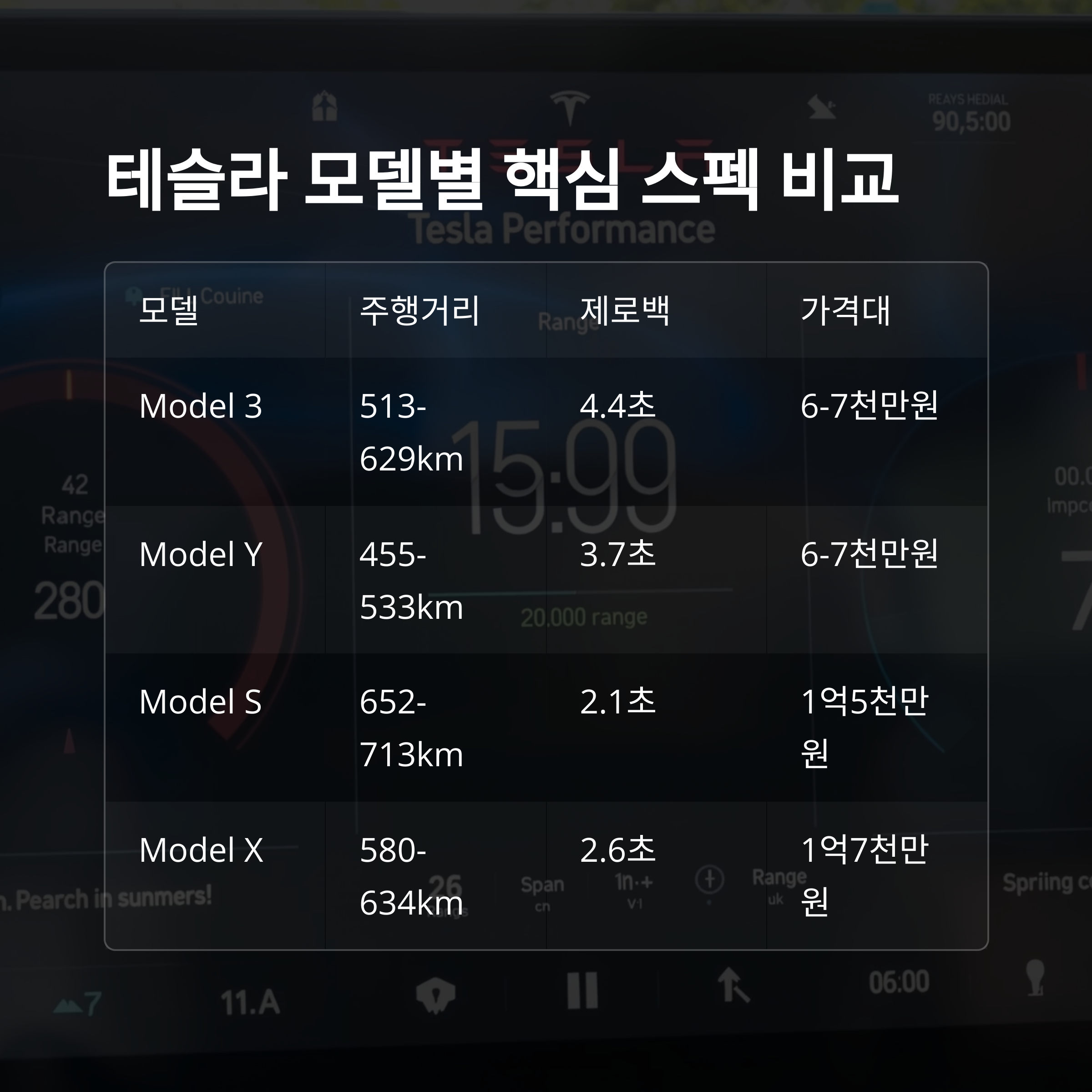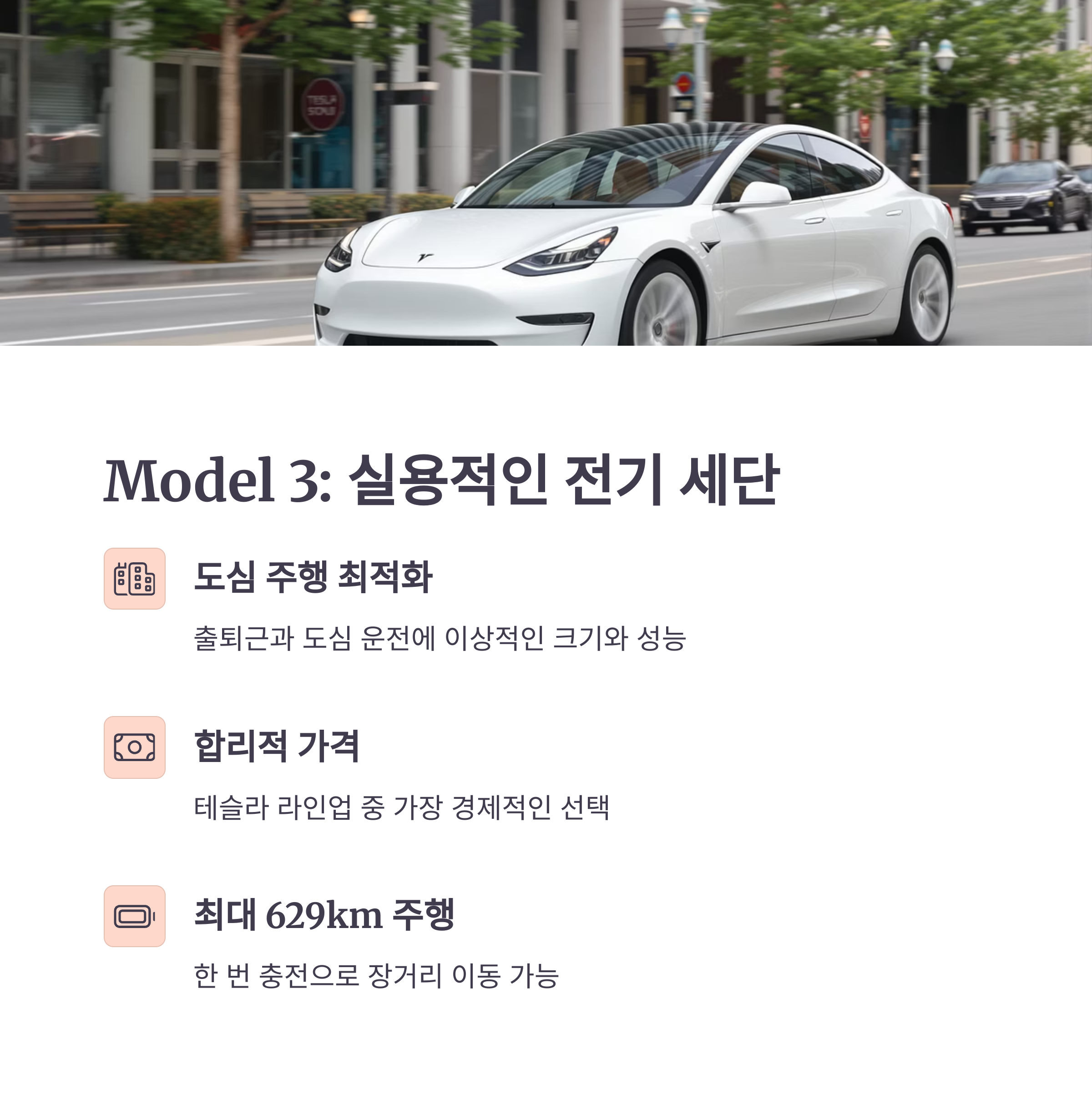 | Model 3 | 약 513~629km | 4.4초 (퍼포먼스) | 약 6천만~7천만 원 |