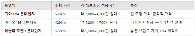 비교해 보면 EV4는 가격 대비 성능과 주행 거리에서 강력한 경쟁력을 갖춘 전기차임을 알 수 있습니다.