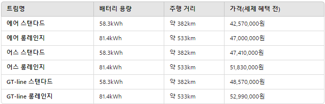 각 모델별로 기본 사양이 다르며, 상위 트림으로 갈수록 디자인 요소와 고급 편의 기능이 추가됩니다. 롱레인지 모델은 대용량 배터리를 탑재하여 최대 533km의 주행 거리를 제공하기 때문에 장거리 운행이 많은 소비자들에게 적합합니다.