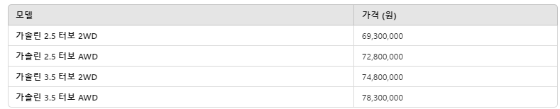 | 현대 팰리세이드 3.8 가솔린 | 약 47,940,000 ~ 58,700,000 |